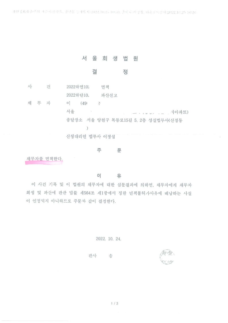 파산 개시결정 : 2022-10-24 사건번호 : 2022하면 00000 서울회생법원