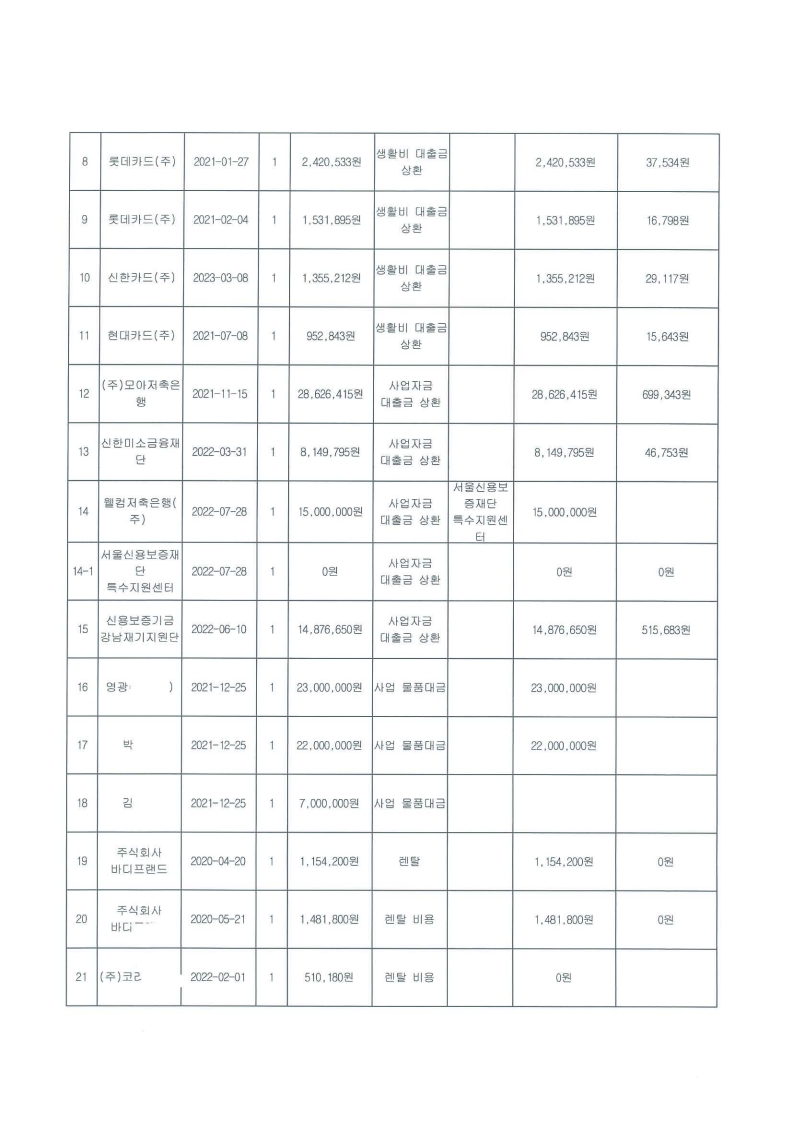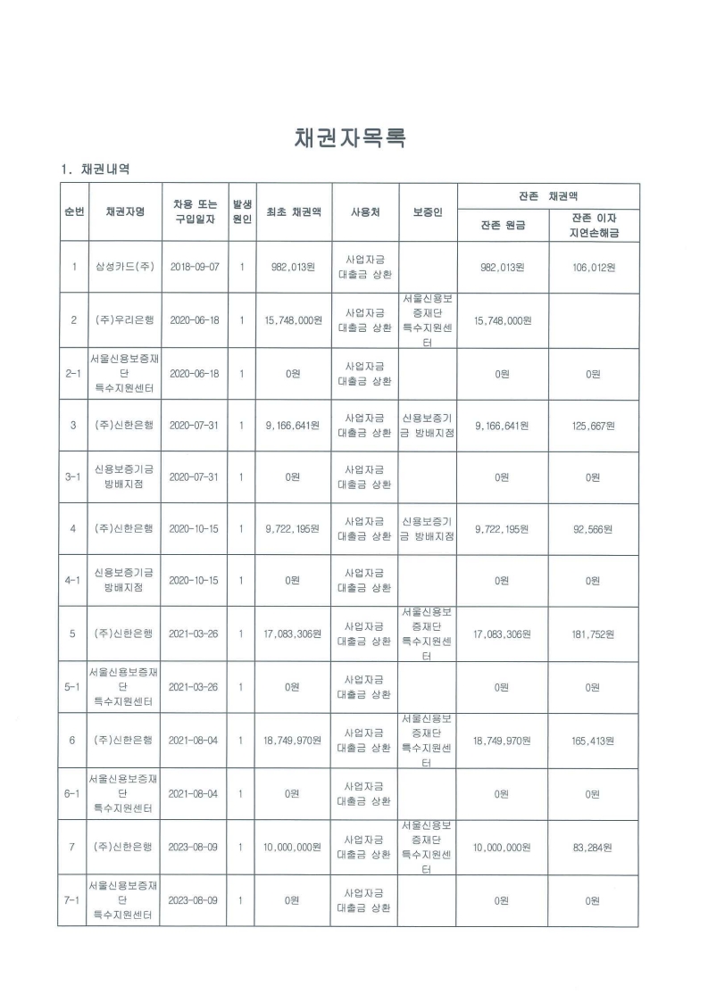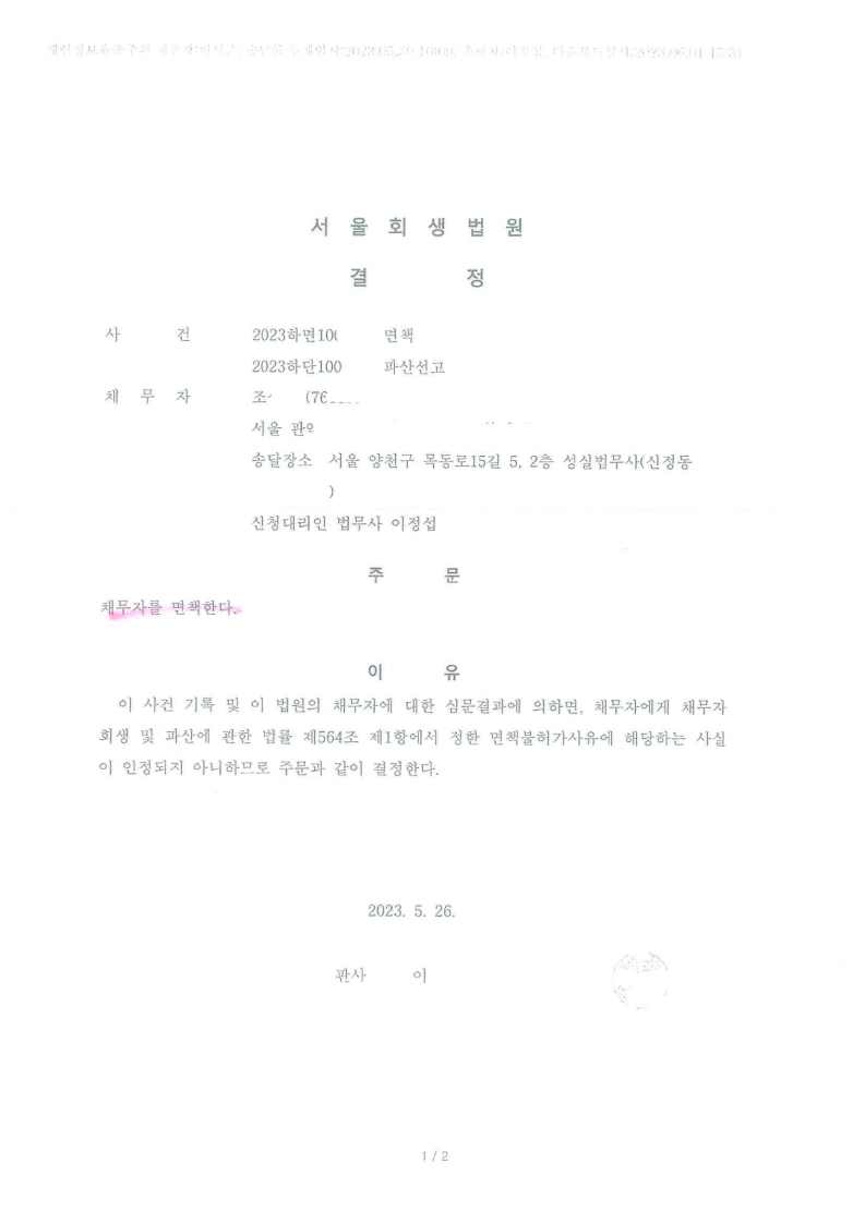 파산 개시결정 : 2023-05-26 사건번호 : 2023하면 00000 서울회생법원