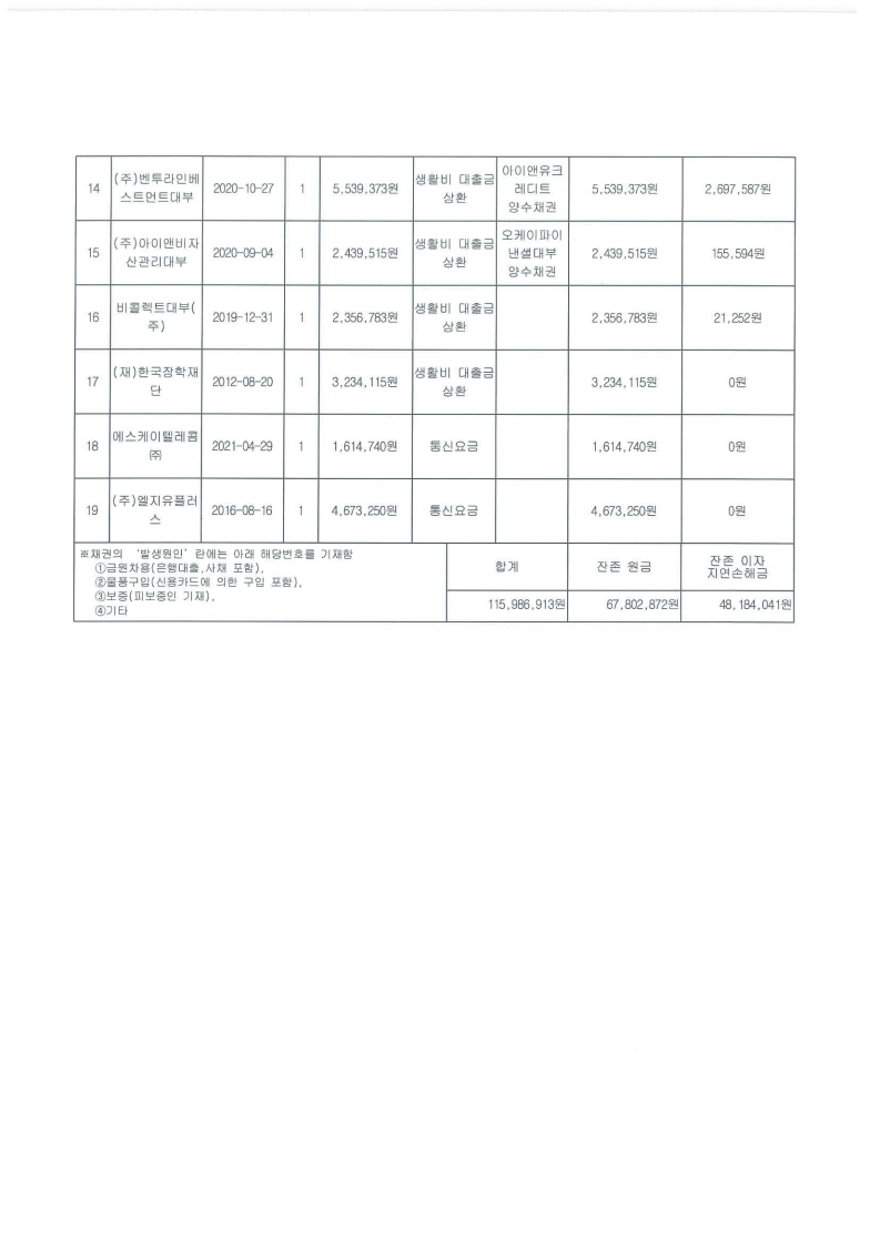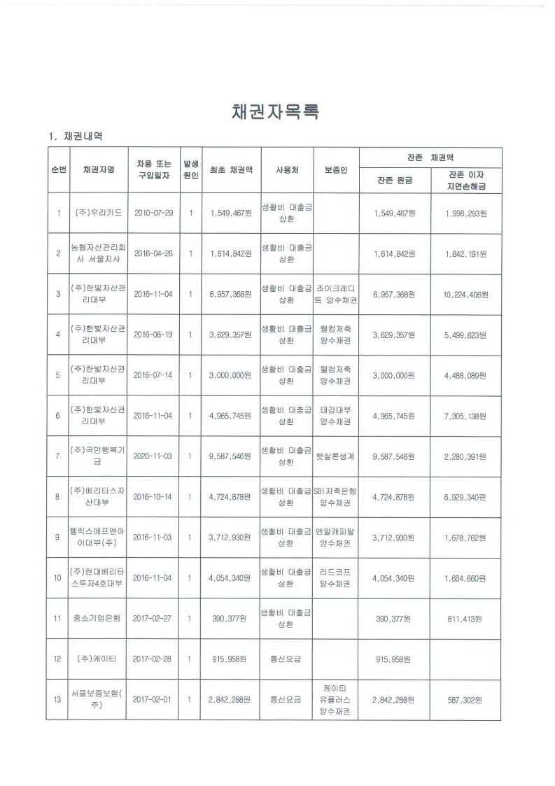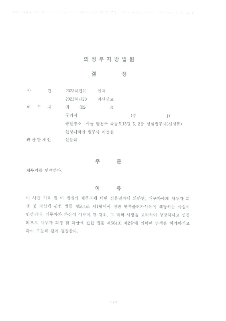 파산 개시결정 : 2024-07-25 사건번호 : 2024하면 00000 의정부지방법원