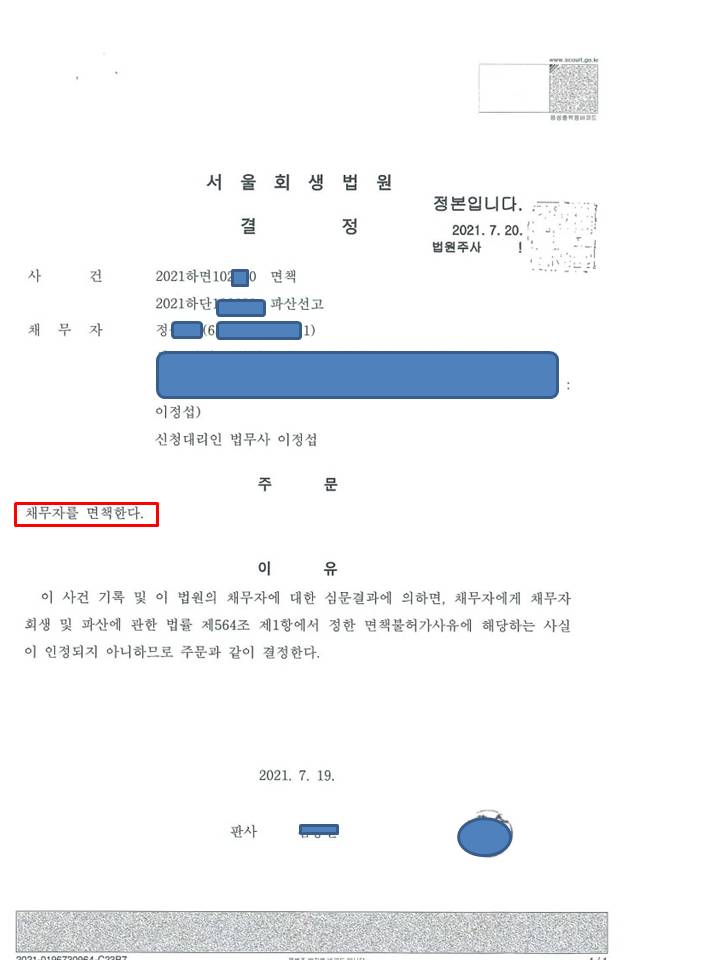 파산 개시결정 : 2021-07-20 사건번호 : 2021하면OOOO 서울회생법원
