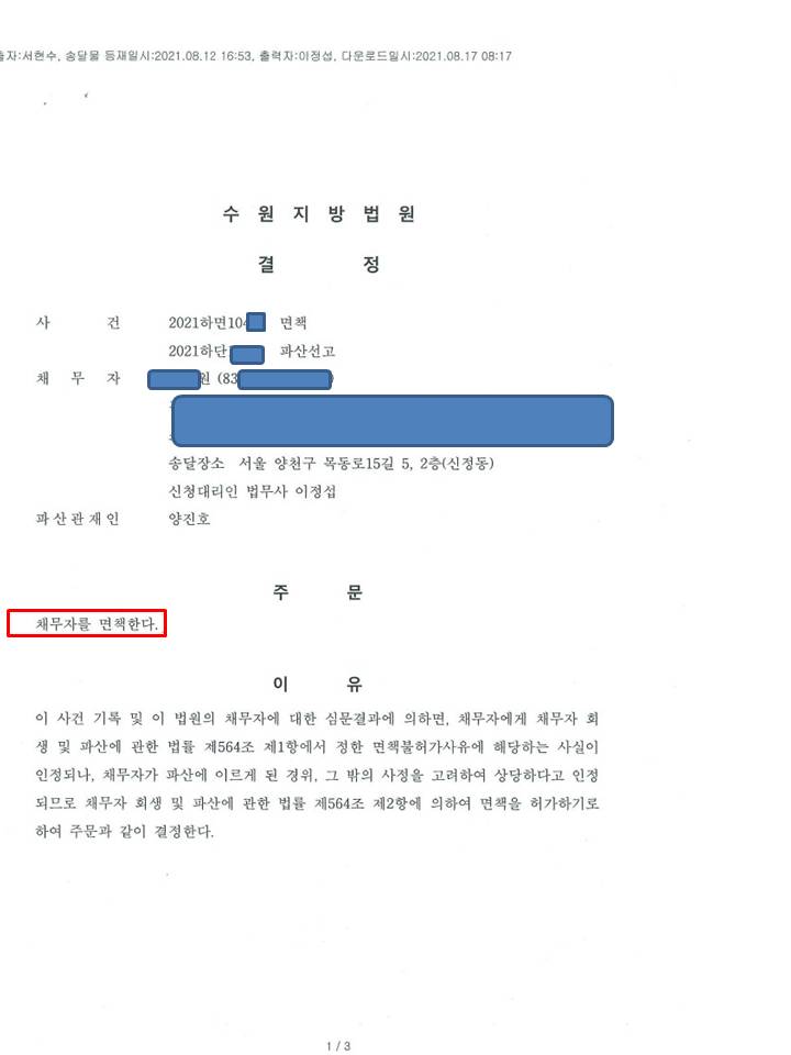 파산 개시결정 : 2021-08-12 사건번호 : 2021하면OOOO 수원지방법원